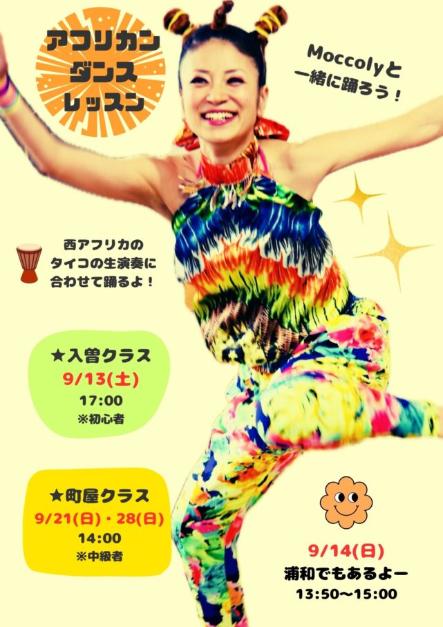 2025年9月26日 金曜日 19:30 更新 アフリカンダンスクラス 涼しくなってくるとカラダが緩んでダルさが出る。だからこそ踊るぞー 9/28(日)町屋 荒木田ふれあい館14:00〜16:00 お問合せ・ご予約09018559651