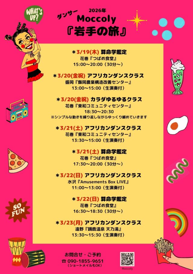 2026年2月5日 木曜日 13:11 更新 GO!岩手! 3月行くよー! 盛岡、遠野、花巻、水沢。 *アフリカンダンスクラス*算命学鑑定*カラダゆるゆるクラス どこかで会おう 🔶お問合わせ09018559651